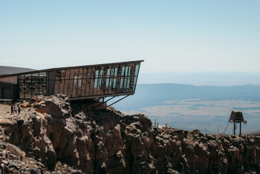 After alighting the train at National Park, you will be transferred by bus to Whakapapa Ski Area, passing the historic (but sadly now closed) Chateau Tongariro.