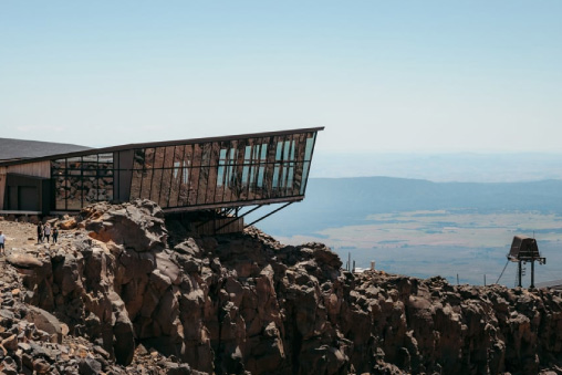 After alighting the train at National Park, you will be transferred by bus to Whakapapa Ski Area, passing the historic (but sadly now closed) Chateau Tongariro.